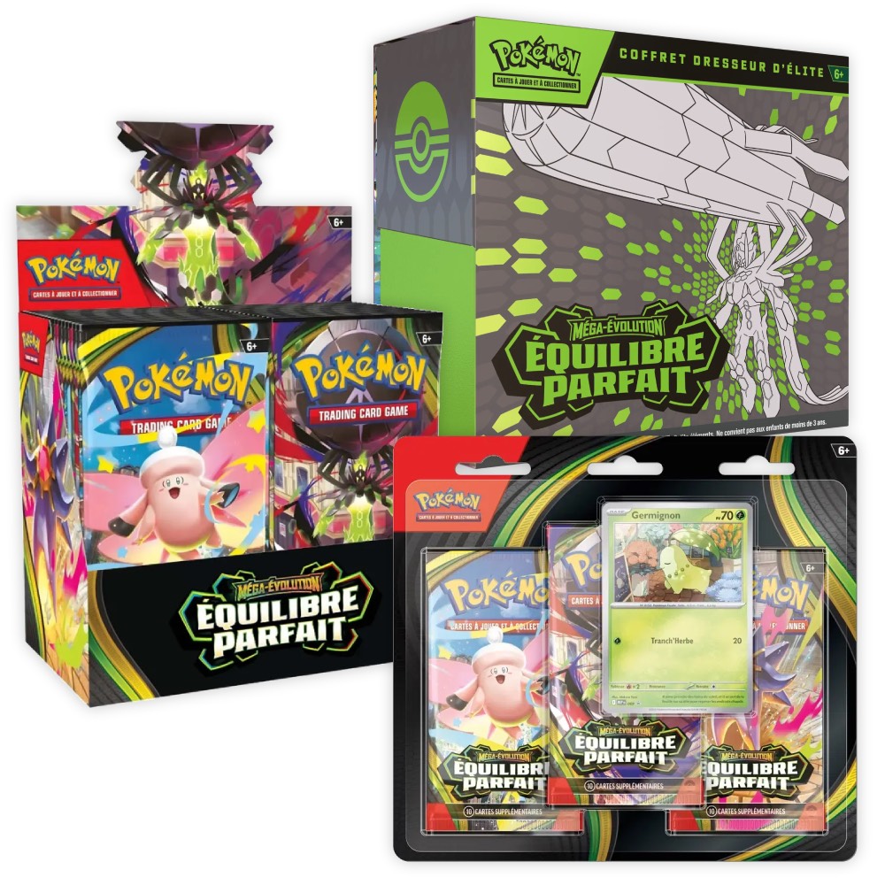 PRECOMMANDE Bundle ME03 (Display + ETB + Tripack) – Équilibre Parfait – Pokémon Bundle contenant une Display, une ETB et un tripack ME03. Introduit Méga-Zygarde-ex et de nouveaux Pokémon Méga-Évolués puissants pour renouveler les stratégies de jeu. Une extension idéale pour renforcer ses decks grâce à de nouvelles cartes clés comme Miaouss-ex. Sortie le 27 mars 2026.