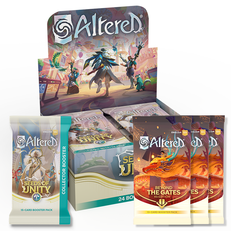 Le Pack Display + Booster Collector + 3 Boosters KS – Altered associe un display et un booster collector en français à trois boosters Kickstarter en anglais, pour une expérience complète mêlant collection et exclusivité.